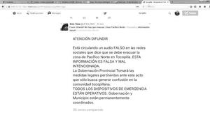 Denunciarán a la justicia falso mensaje sobre evacuación